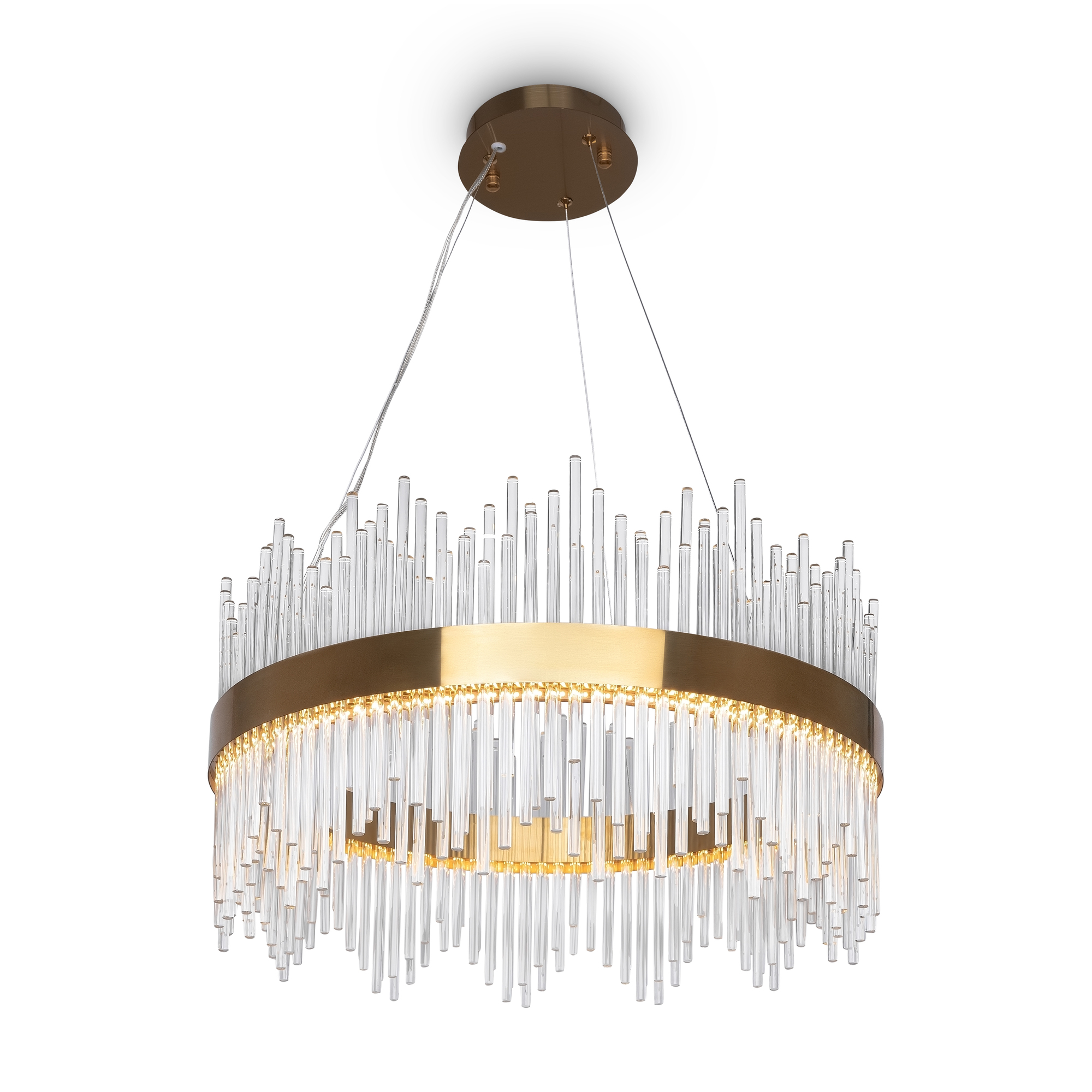 Металлическая арматура. Цвет – золото. Декор в виде прозрачных стеклянных трубок. Трендовый эффект парения. LED-источники света энергоэффективны и долговечны в эксплуатации.