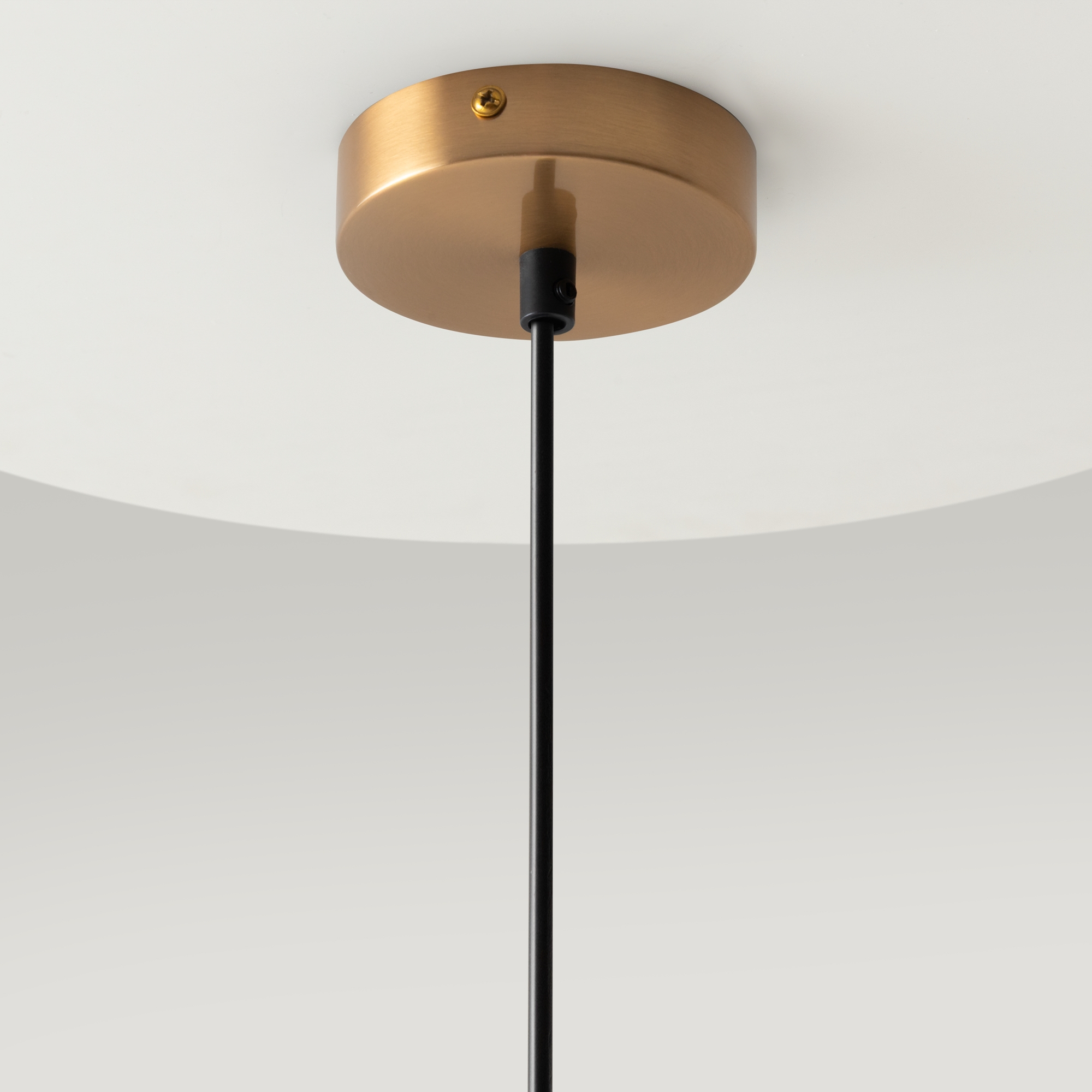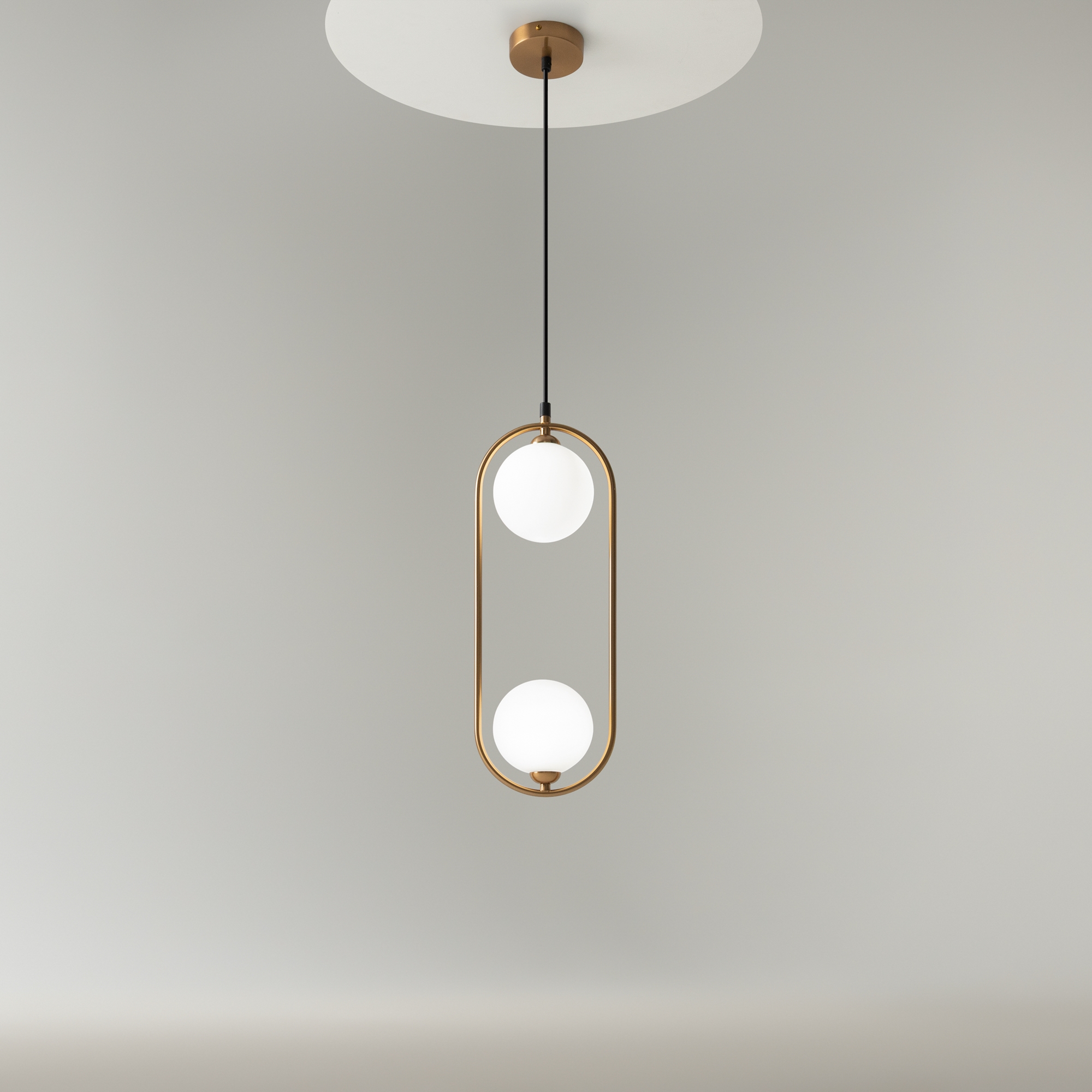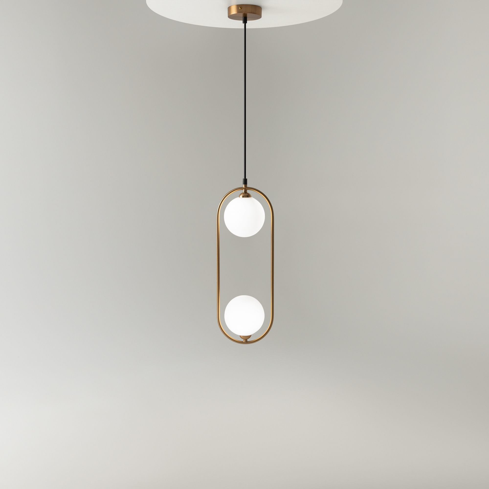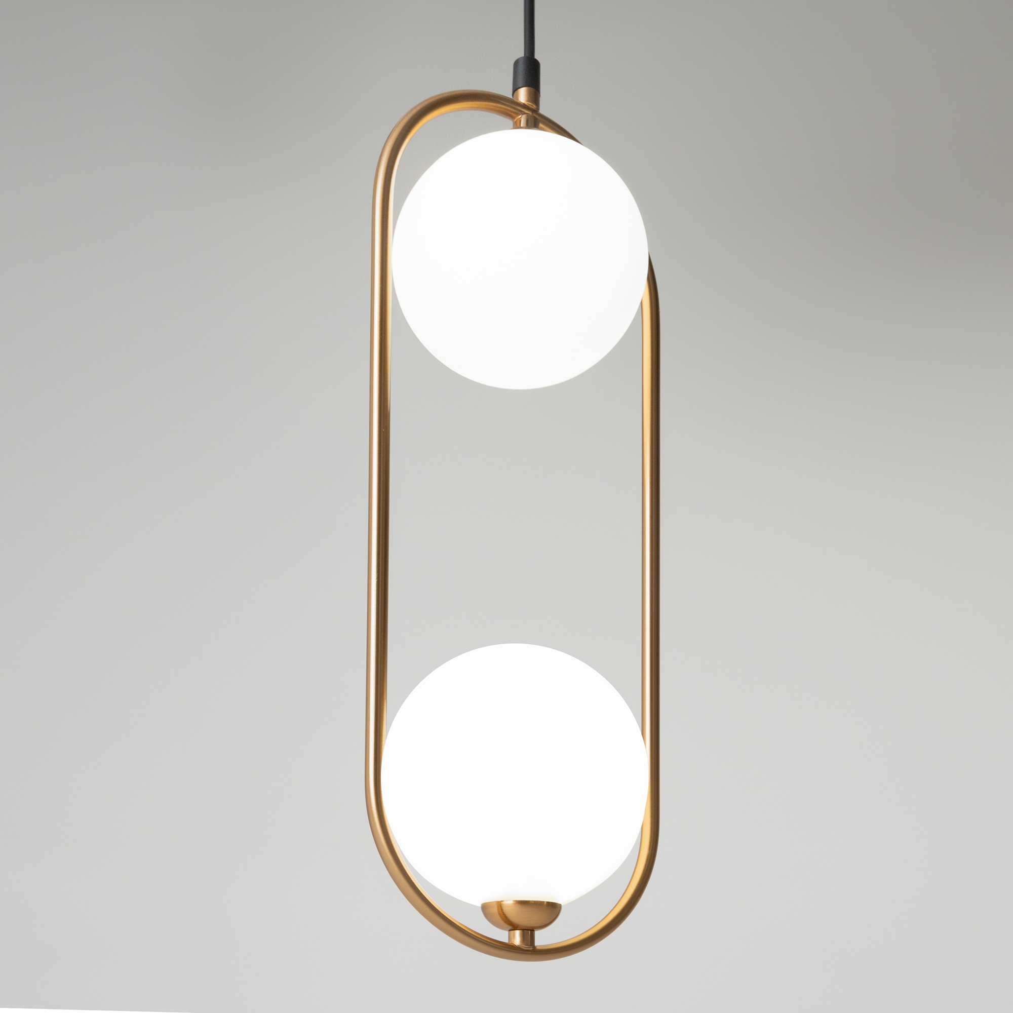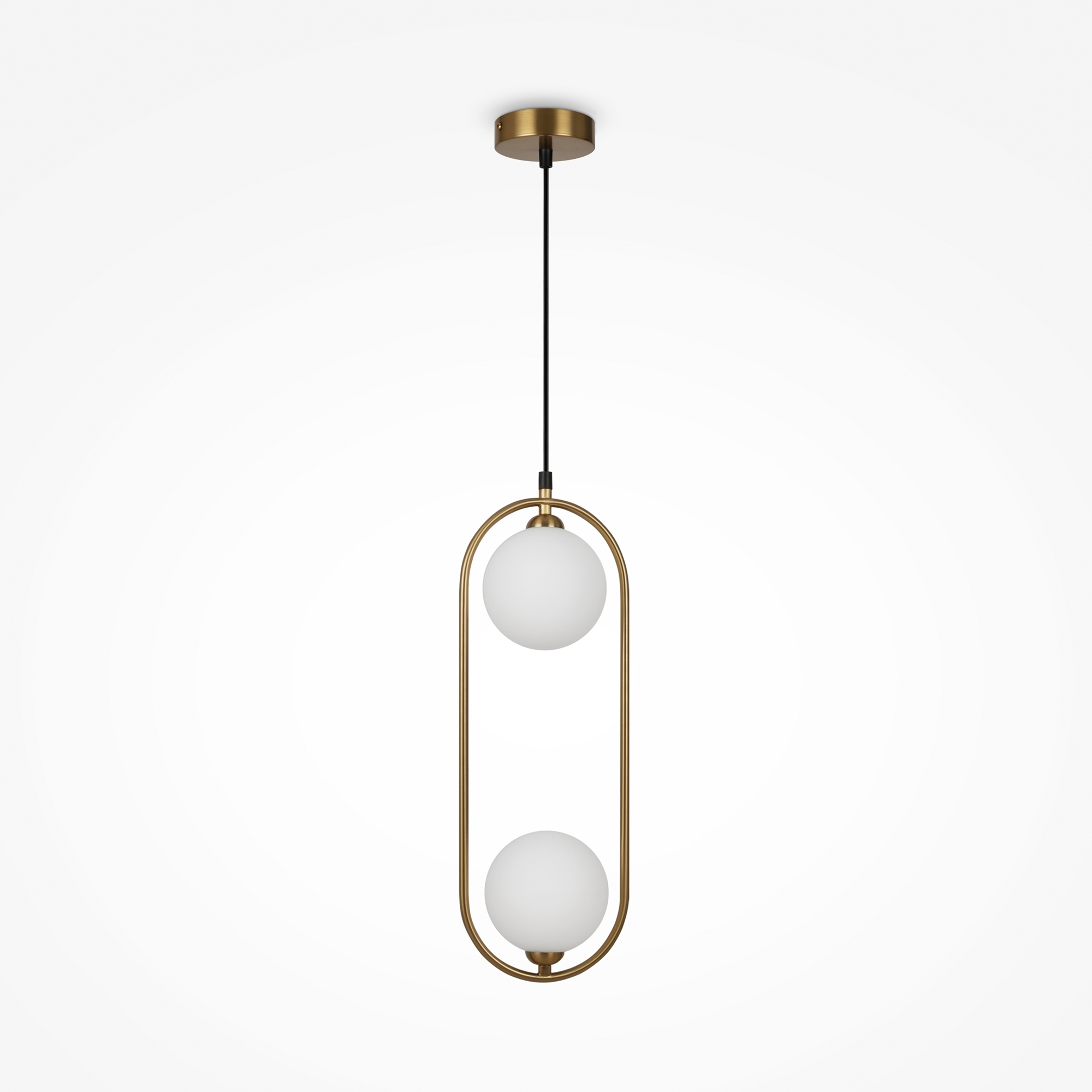Арматура из металла в трех оттенках: белый, черный, латунь. Плафоны-сферы закреплены на округлом металлическом каркасе. Материал плафонов — выдувное стекло, цвет — белый. Высота подвесных моделей регулируется.