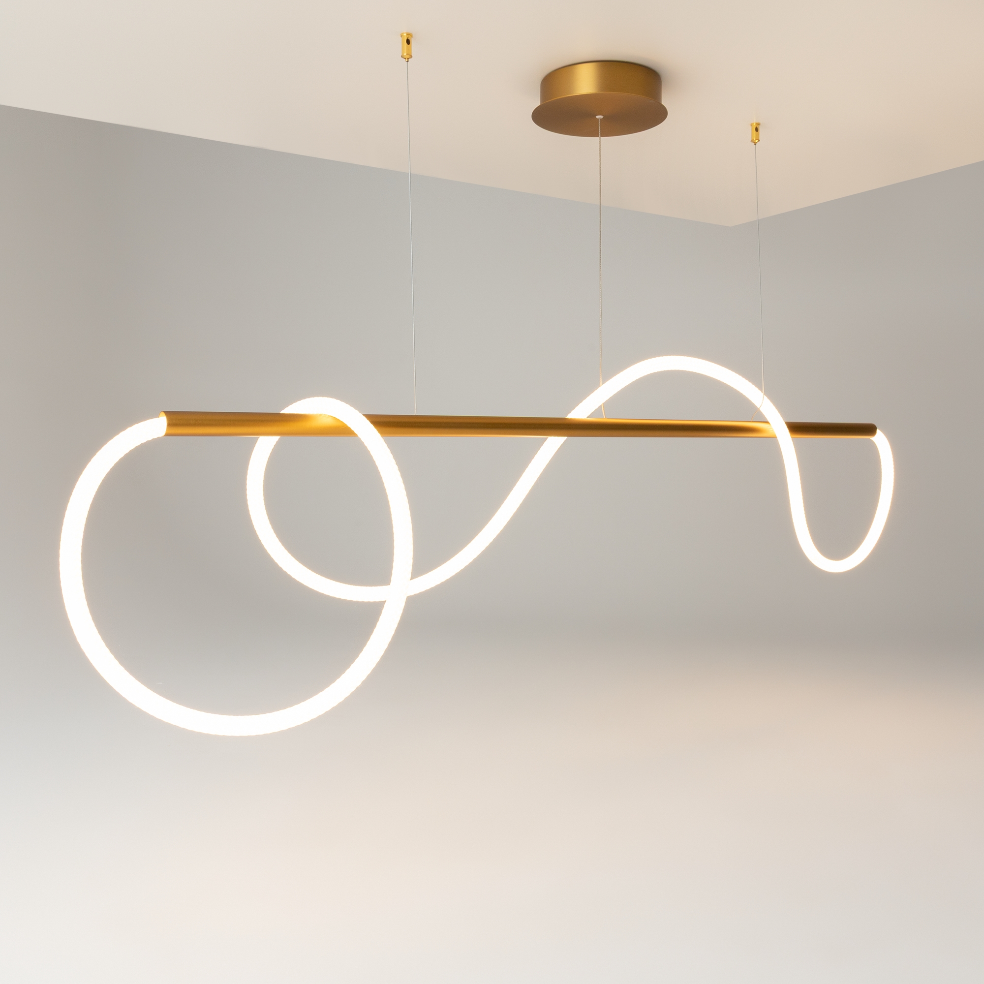 Алюминиевый корпус. Оттенки – золотой, матовый черный. Рассеиватель двух видов – силиконовая трубка и сверхкрепкий жгут (не желтеет со временем, обладает высокой прочностью). Мягкое равномерное свечение благодаря высокой плотности светодиодов. Цветовая температура 3000К. LED-источник света.