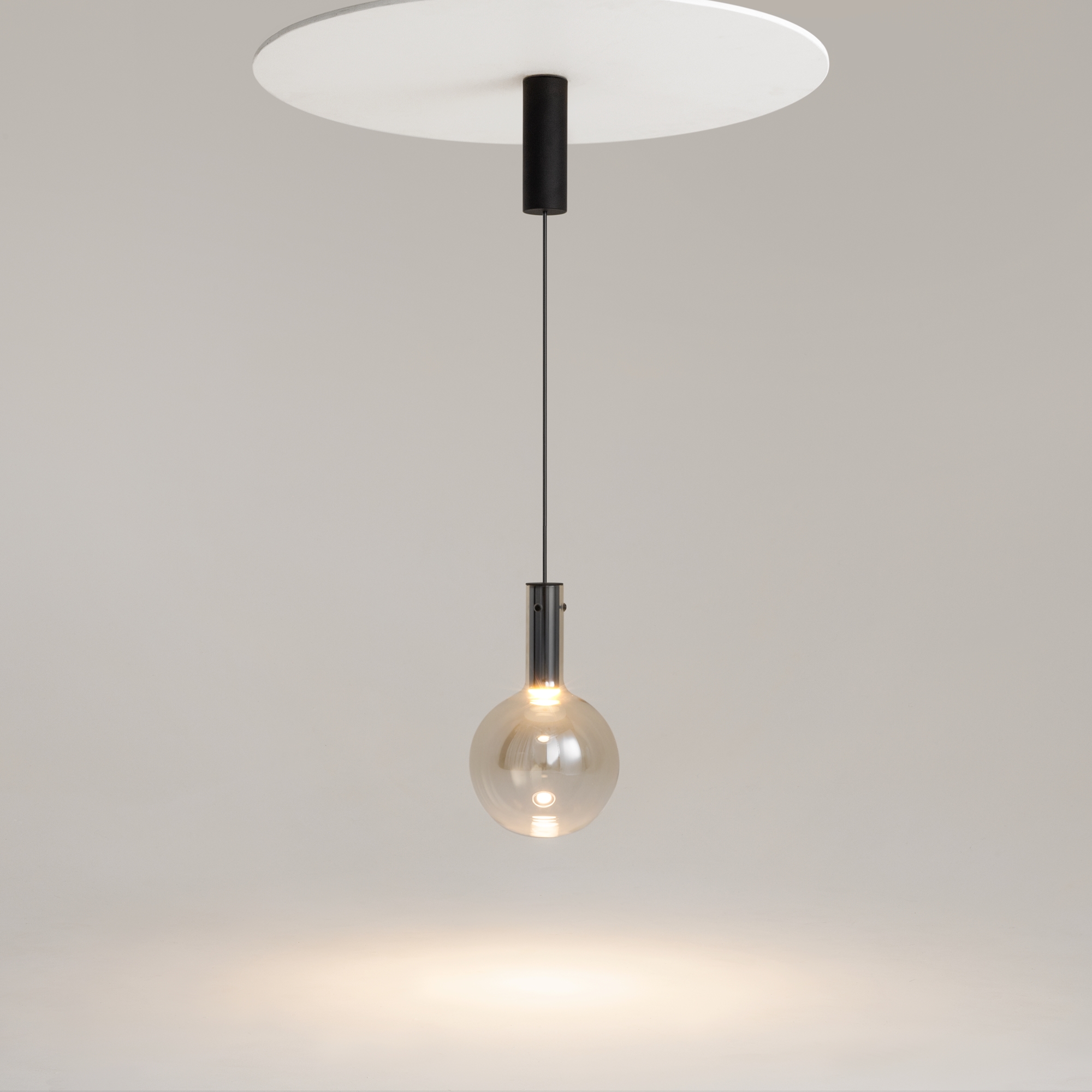 Металлическая арматура, цвет - черный, белый.  Выдувной плафон-шар из стекла с вытянутым цилиндрическим основанием в трех цветах: дымчато-черный, туманно-белый, бежево-коньячный. LED-источник света в основании плафона. Цветовая температура 3000К. Два диаметра плафонов и регулируемая длина проводов для создания разнообразных композиций.