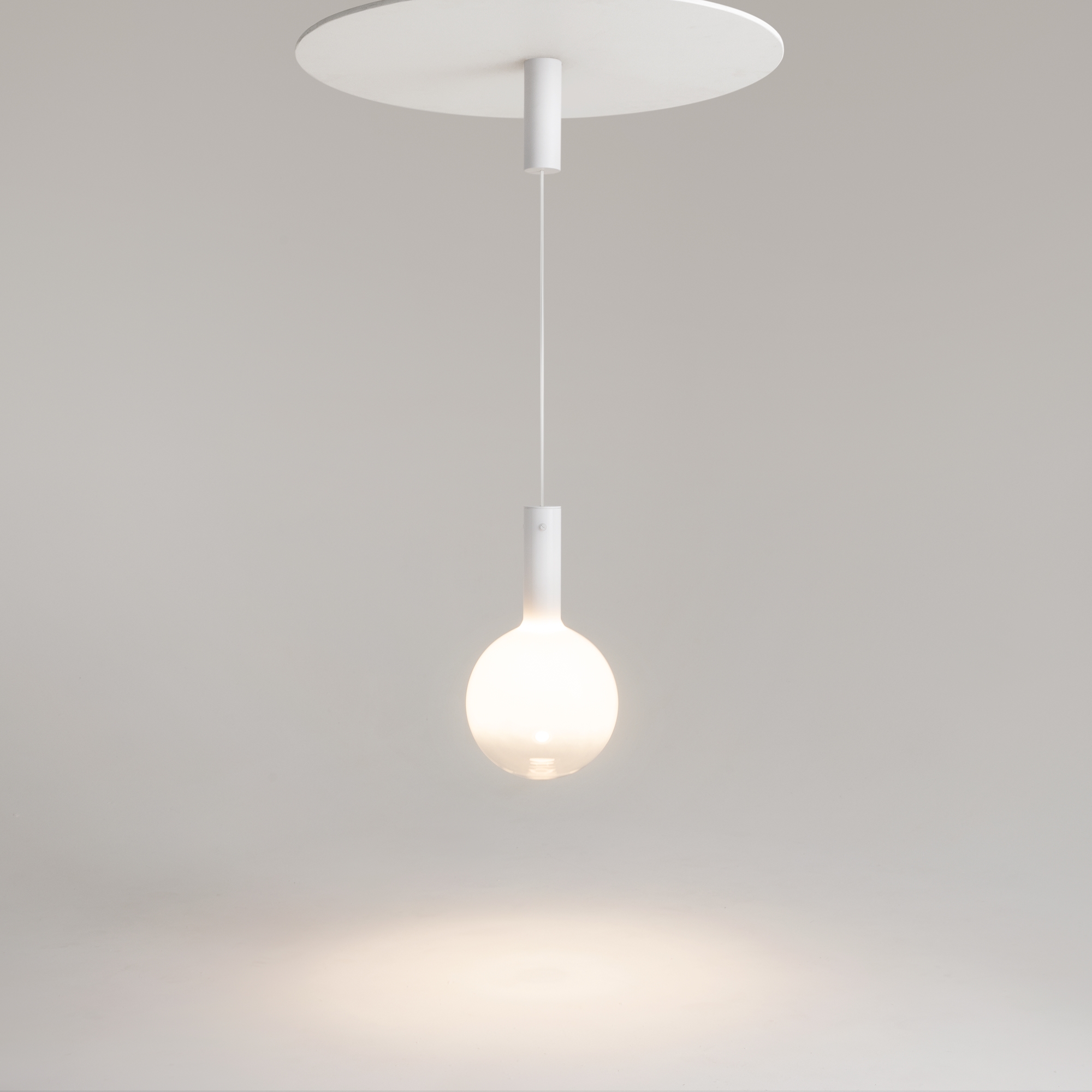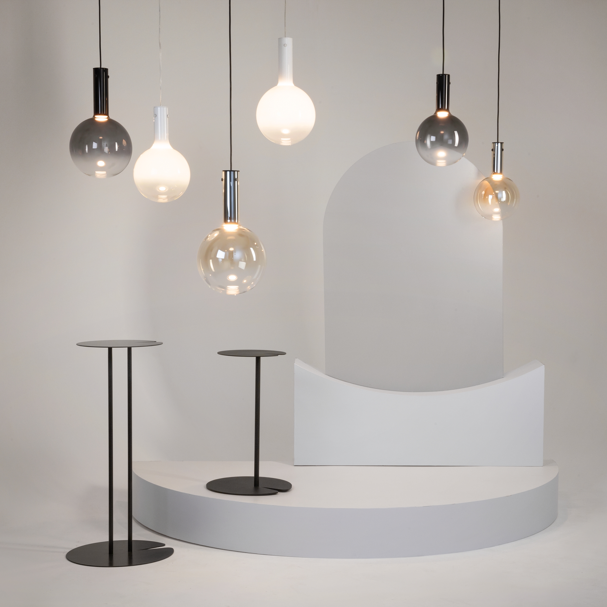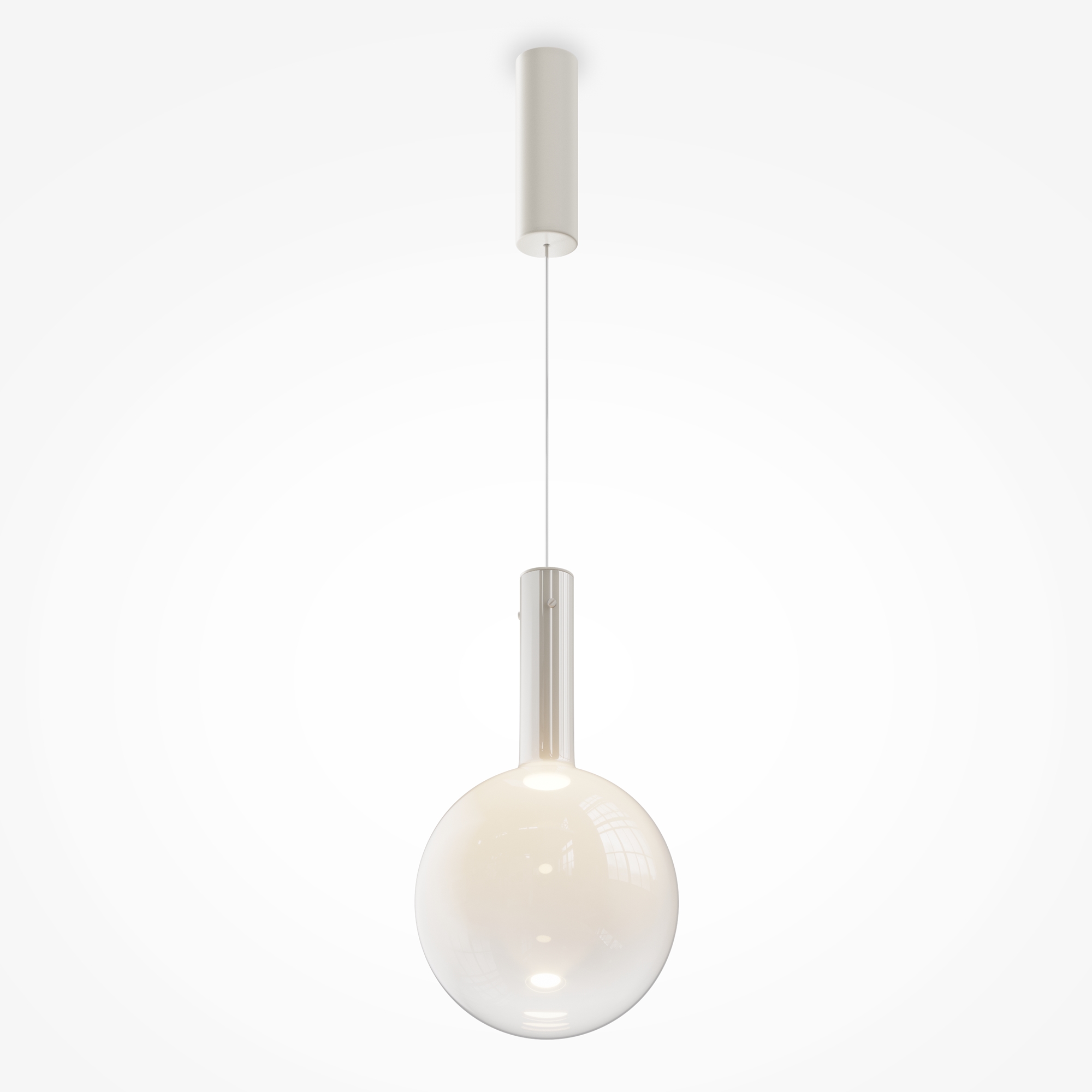 Металлическая арматура, цвет - черный, белый.  Выдувной плафон-шар из стекла с вытянутым цилиндрическим основанием в трех цветах: дымчато-черный, туманно-белый, бежево-коньячный. LED-источник света в основании плафона. Цветовая температура 3000К. Два диаметра плафонов и регулируемая длина проводов для создания разнообразных композиций.