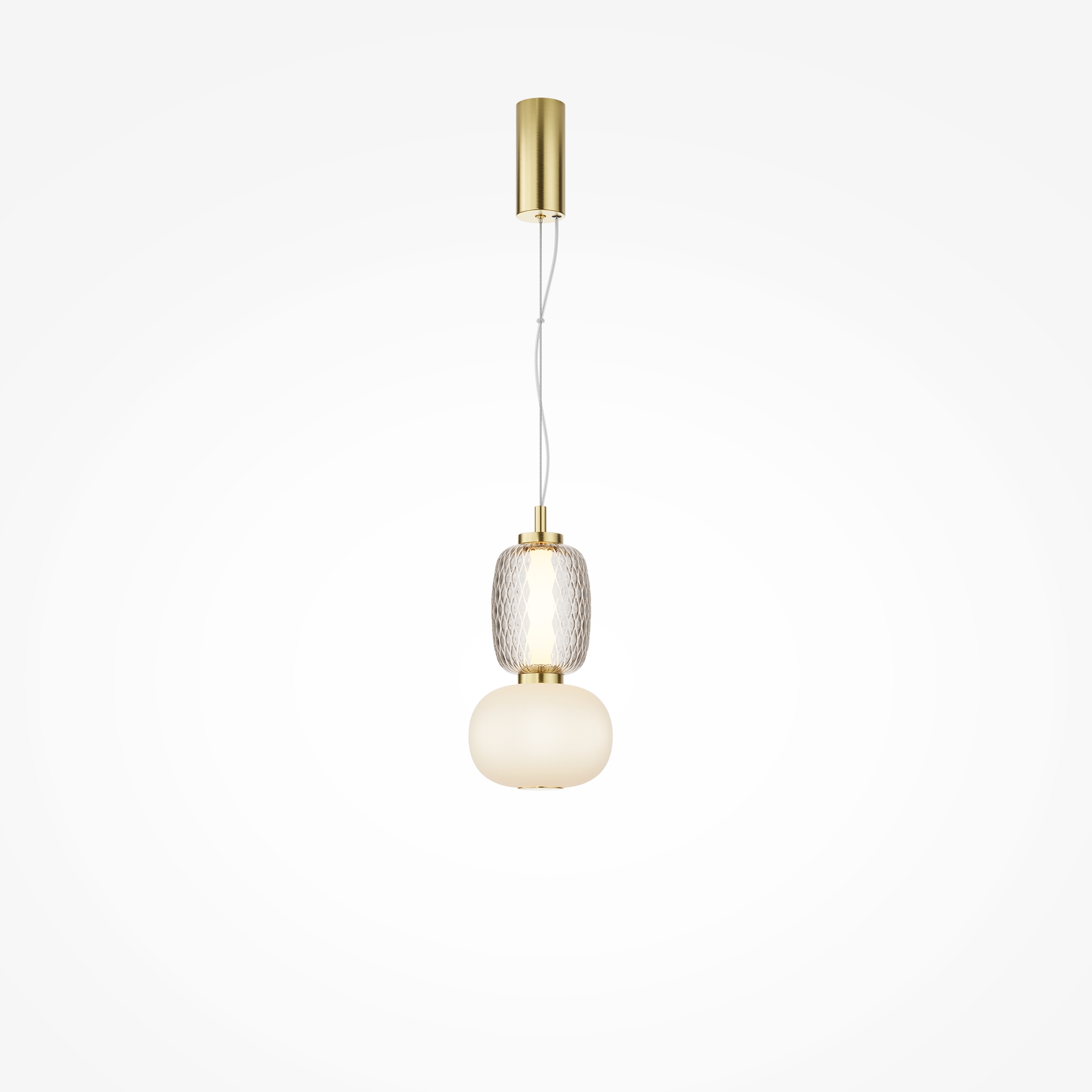 Металлическая арматура, цвет - золото, хром. Микс плафонов округлых и вытянутых форм из белого  матового и прозрачного стекла с сетчатым и с линейным повторяющимся рельефным рисунком. Регулируемая высота подвесных моделей, провод - 3 метра. LED-источник света, цветовая температура  3000К.