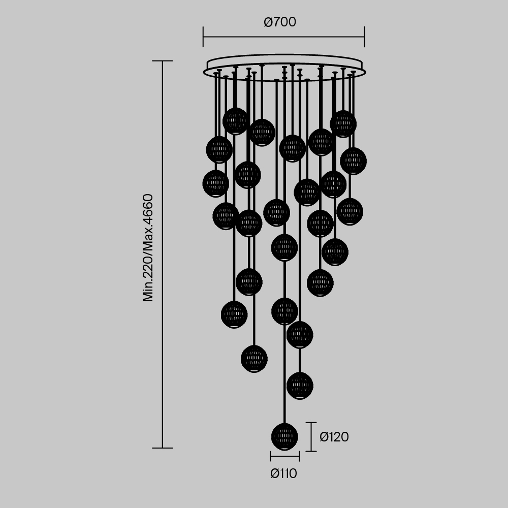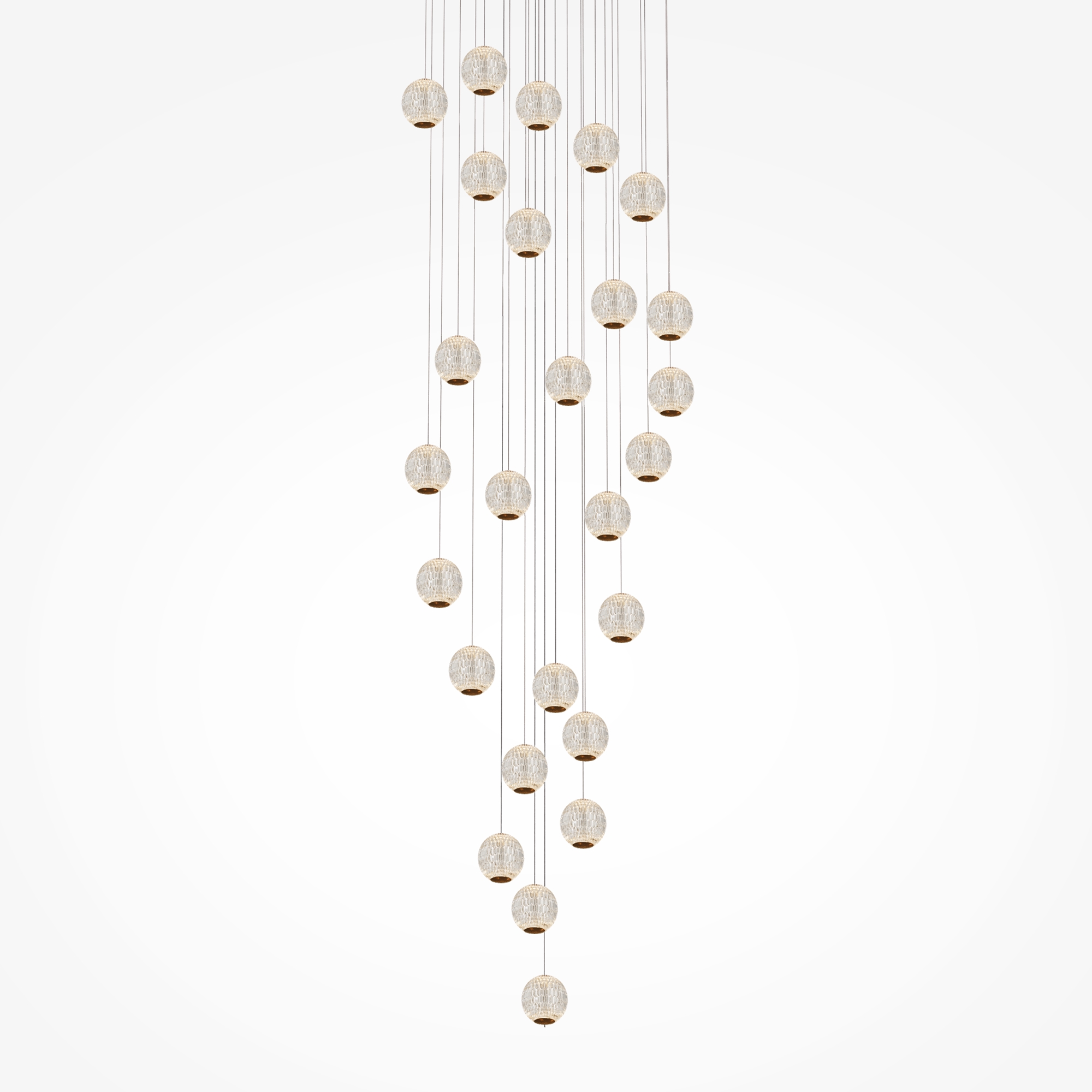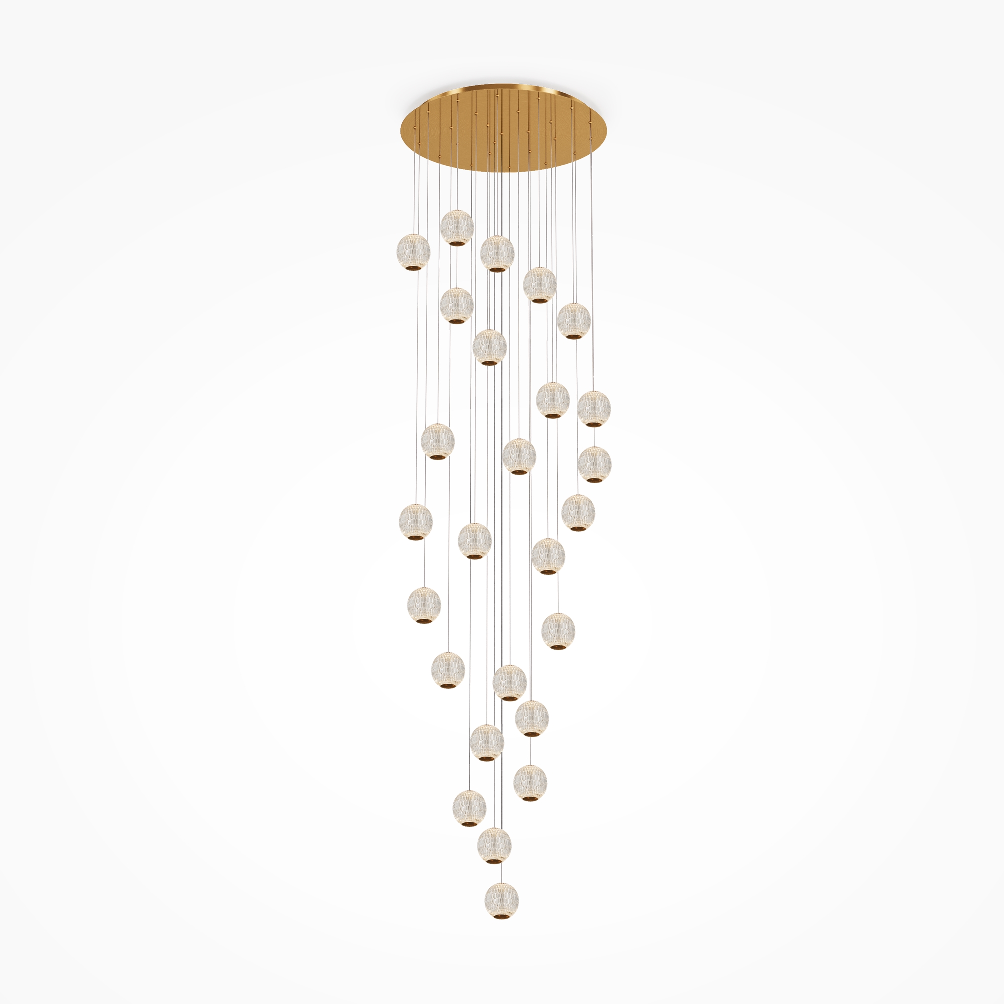 Цвет арматуры — латунь, плафоны из прозрачного акрила. Подвесной светильник с прочными и легкими плафонами из акрилового стекла снаб жен встроенным LED-источником света. LED-модуль дает теплый свет с цветовой температурой 3000К. Длина провода — 3 метра, ее можно  регулировать для установки в помещении с высокими потолками.