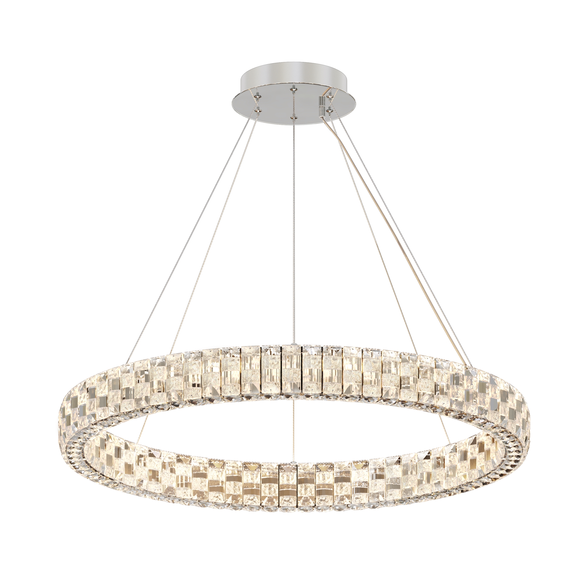 Металлическая арматура в двух вариантах цвета  — хром или золото. Прозрачные декоративные элементы из хрустального стекла.  Широкое кольцо снабжено LED-источником света. Цветовая температура потока излучения — 3000 К, угол рассеивания — 120 градусов. Регулируемый по высоте провод длиной 3 метра. Украшение шахматным рисунком.