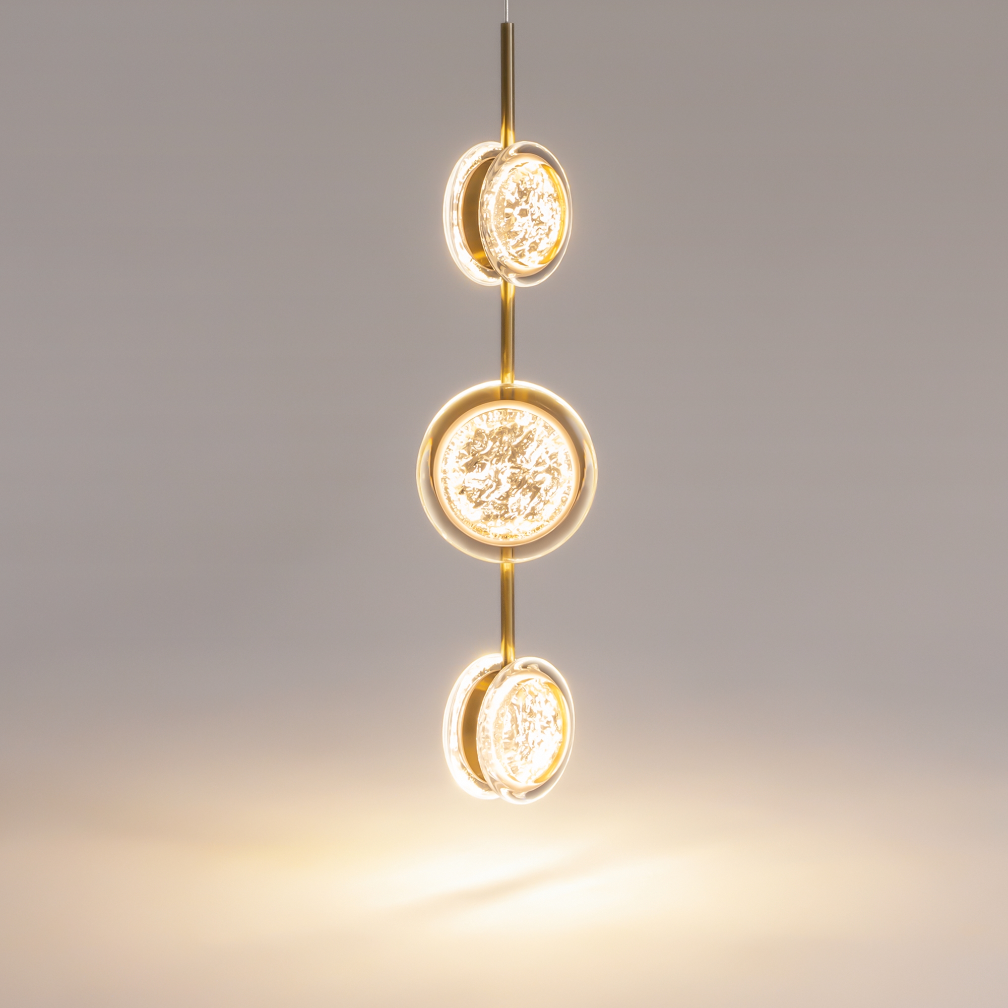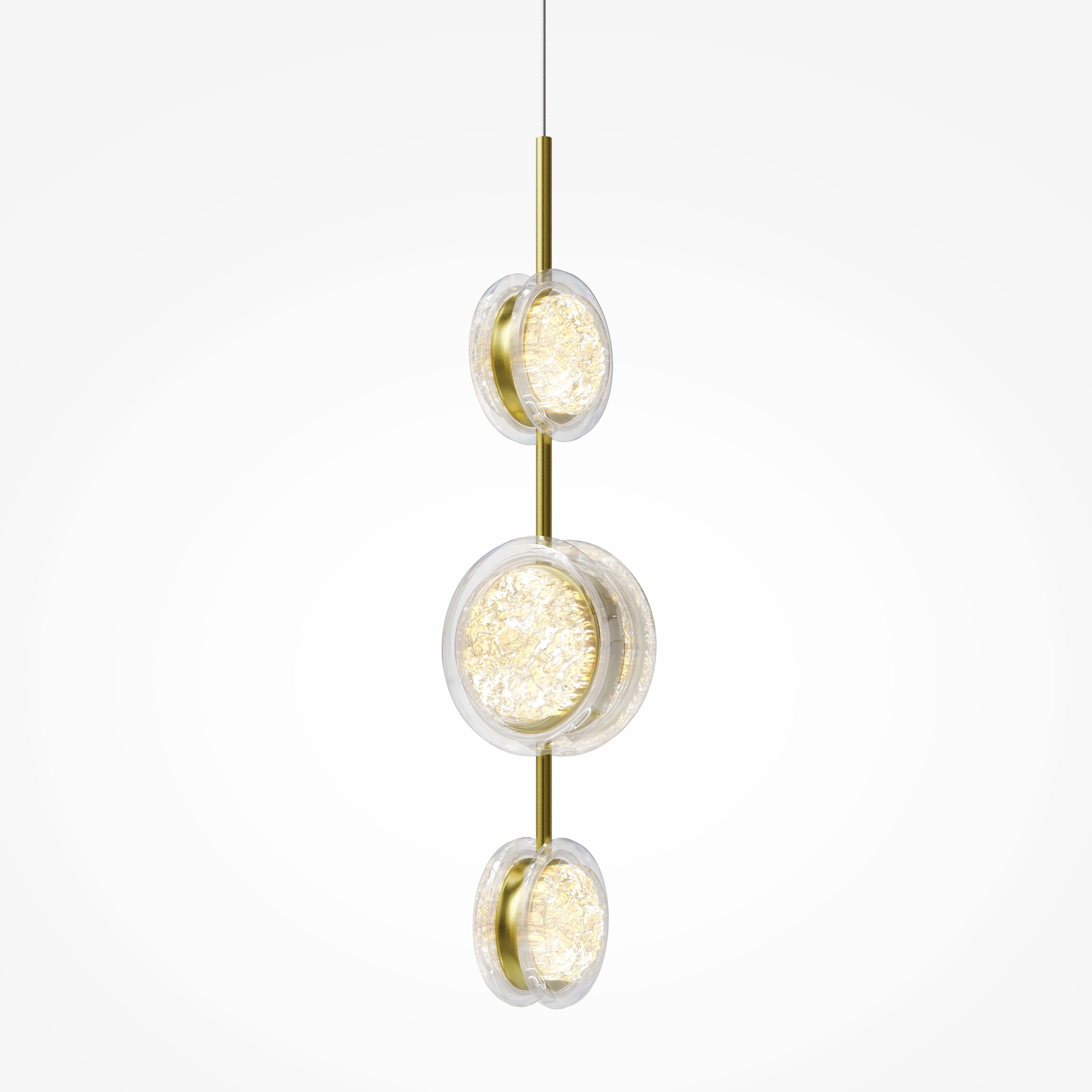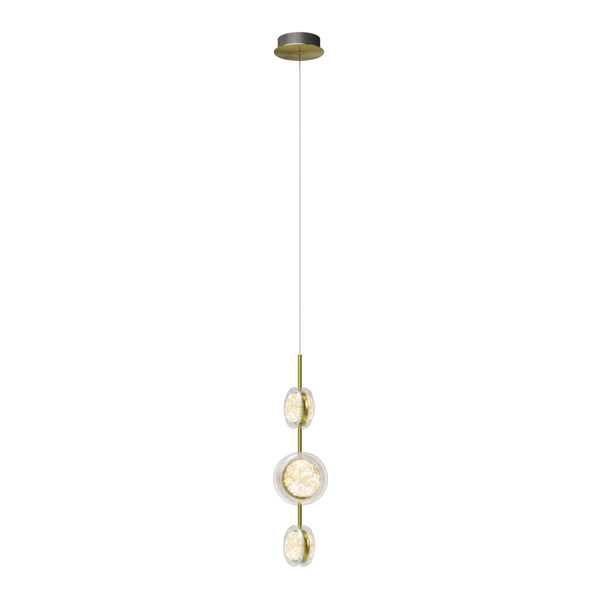Арматура из металла цвета латунь с сатинированным финишным покрытием сочетается с прозрачными плафонами. Подвесные одинарные, горизонтальный и каскадные светильники оснащаются LED-модулем с двумя плоскими плафонами из акрила со сложным, актуальным паттерном на поверхности. Цветовая температура — 3000К, угол рассеивания — 125 градусов.