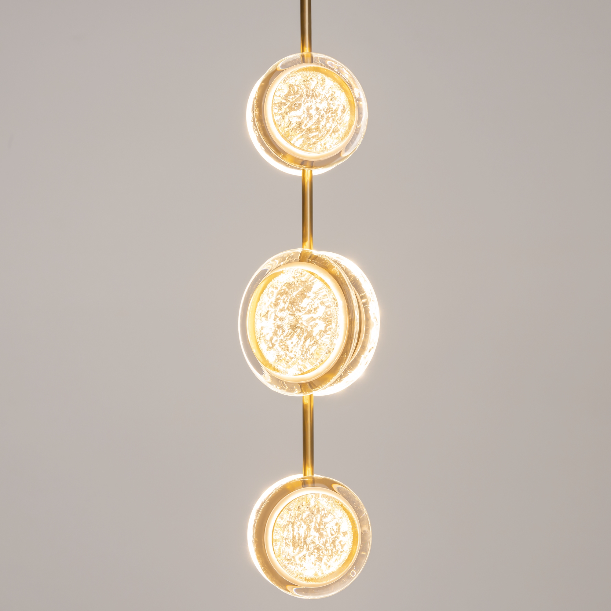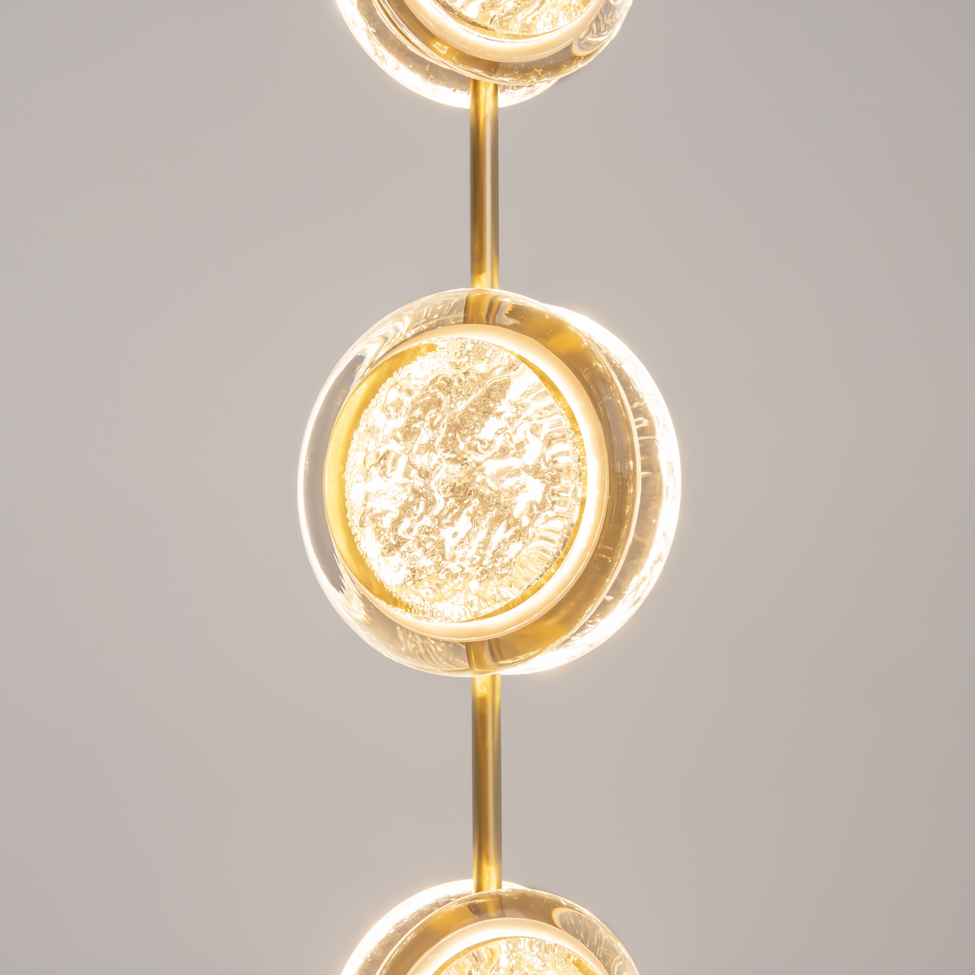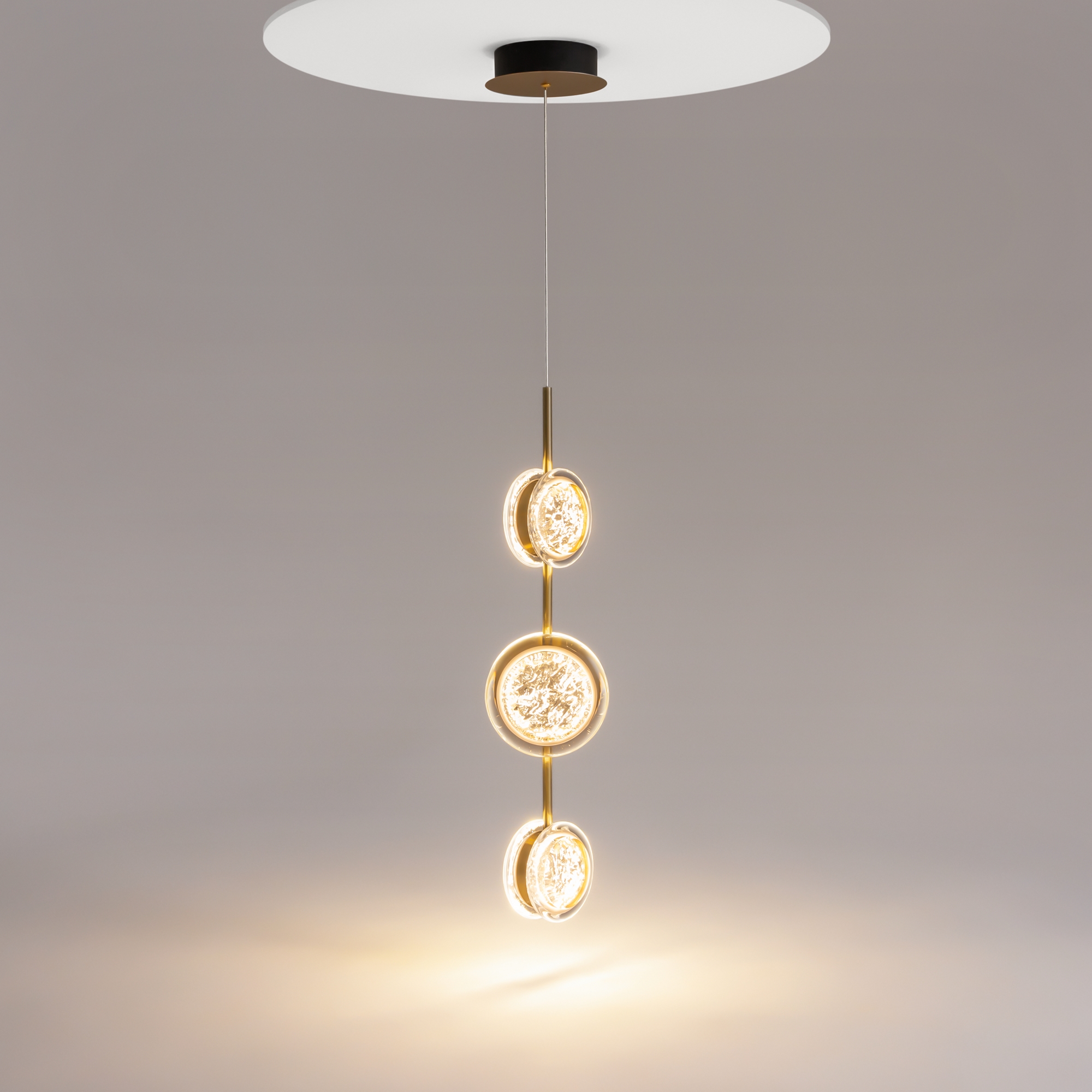 Арматура из металла цвета латунь с сатинированным финишным покрытием сочетается с прозрачными плафонами. Подвесные одинарные, горизонтальный и каскадные светильники оснащаются LED-модулем с двумя плоскими плафонами из акрила со сложным, актуальным паттерном на поверхности. Цветовая температура — 3000К, угол рассеивания — 125 градусов.