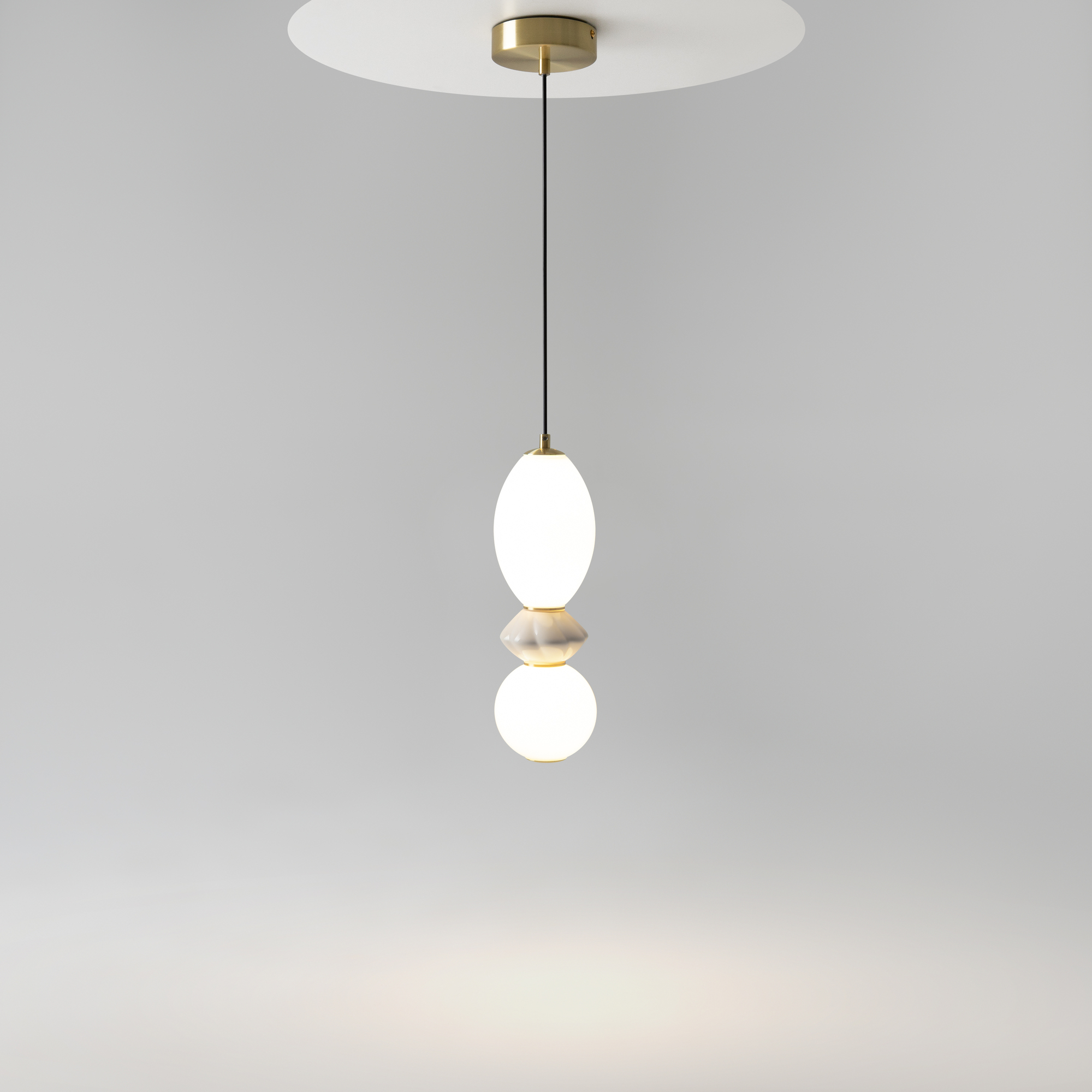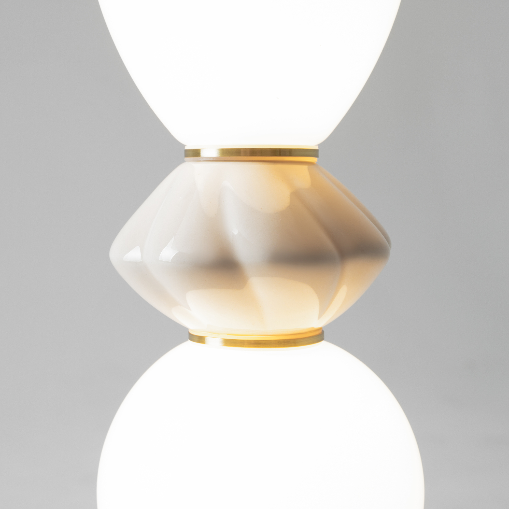 Светильники Brosche подобно броши завершают образ интерьера. В серии представлены подвесные светильники, бра и настольная лампа.  Декоративная керамическая бусина покрыта глазурью: кремово-белая (RAL 9001) или серебристо-серая (RAL 7001). Металлическая арматура цвета сатинированной латуни; белые плафоны из глянцевого стекла. Мягкое рассеивание света (3000K) от встроенного LED-источника привносит уют.  Светильники Brosche подходят для зонирования пространства в спальнях, гостиных и столовых.