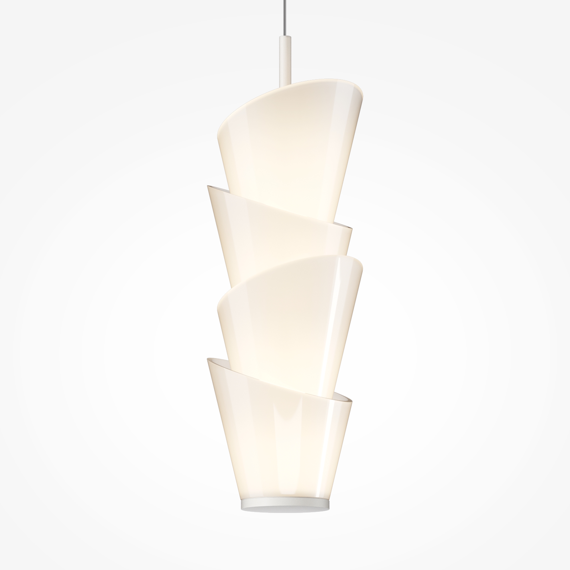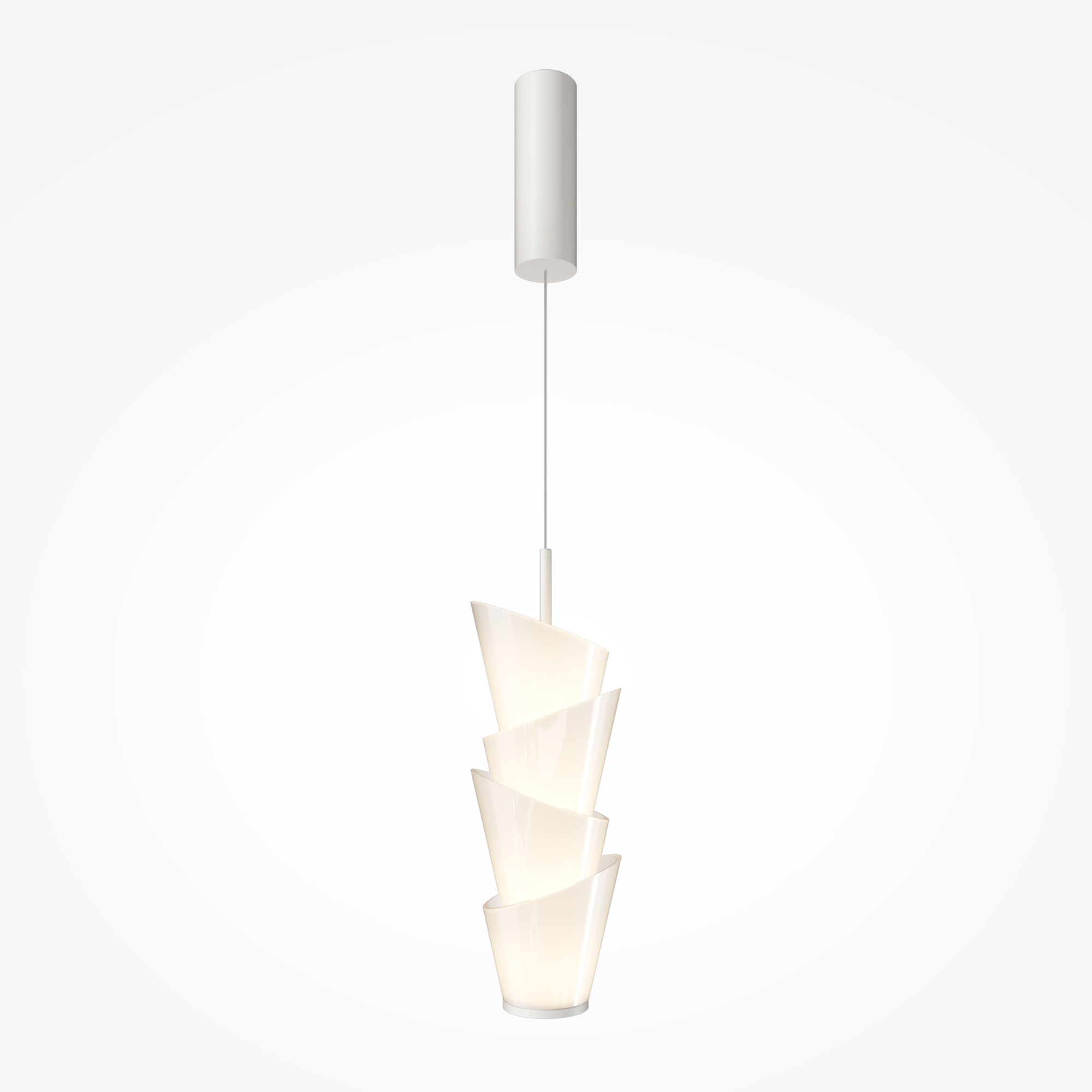 Многогранный светильник-трансформер. Возможность изменения дизайна путем поворота стеклянных плафонов. Цвет арматуры — белый. Материал арматуры — металл. LED-источник света с многоуровневым матовым рассеивателем. Конструкция с вращающимися элементами из белого эмалированного стекла. Шестиугольное основание со светодиодными платами для мощного равномерного освещения. Регулируемая высота подвеса и провод длиной 3 метра для адаптации к высоким потолкам.