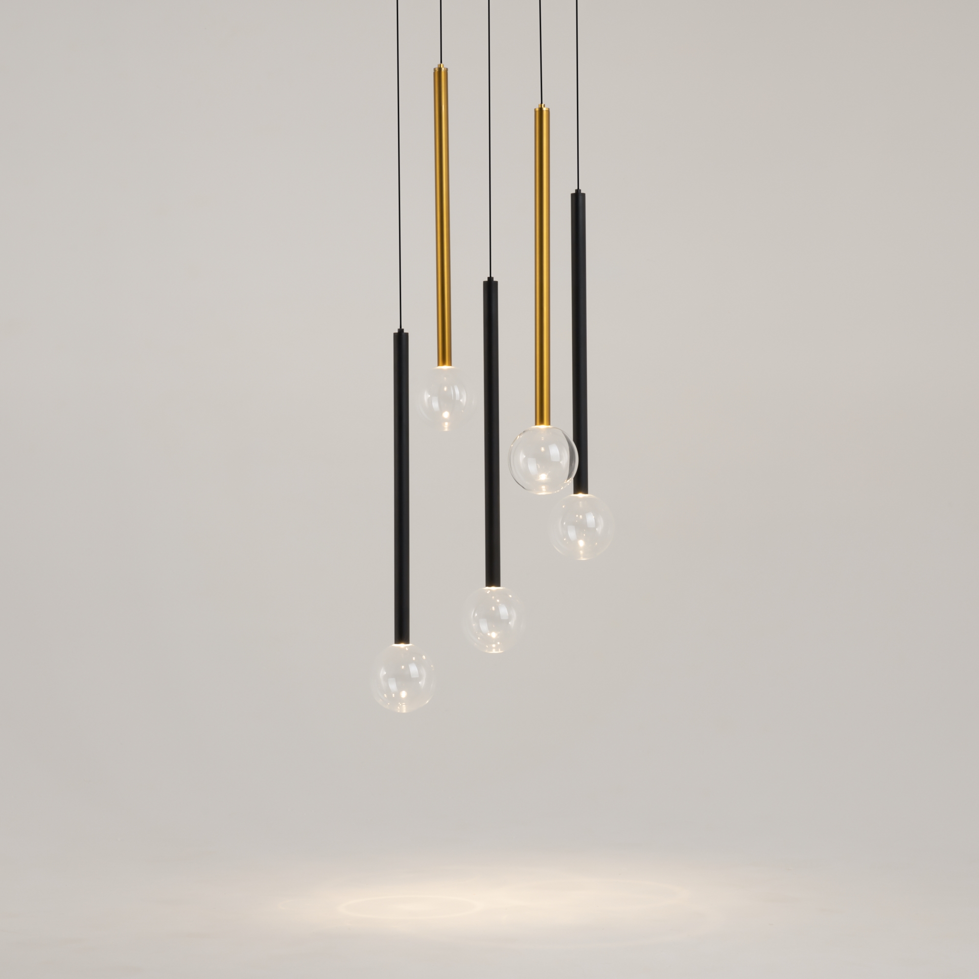 Цвет арматуры — черный, латунь, комбинация черный и латунь. Материал арматуры — металл. Цветовая температура 3000К. Оригинальный «невесомый» дизайн с тонкими металлическими трубками и стеклянными шарами-плафонами. LED-источники света. Регулируемая длина провода подвесных светильников, 3 метра, подходит для помещений с высокими потолками. Каскадная композиция на 7 и 15 плафонов оснащена проводом длиной 3,5 метра для эффектных дизайнерских решений. Подходит для высоких потолков. Парящие модели для создания легкой, воздушной атмосферы в интерьере.