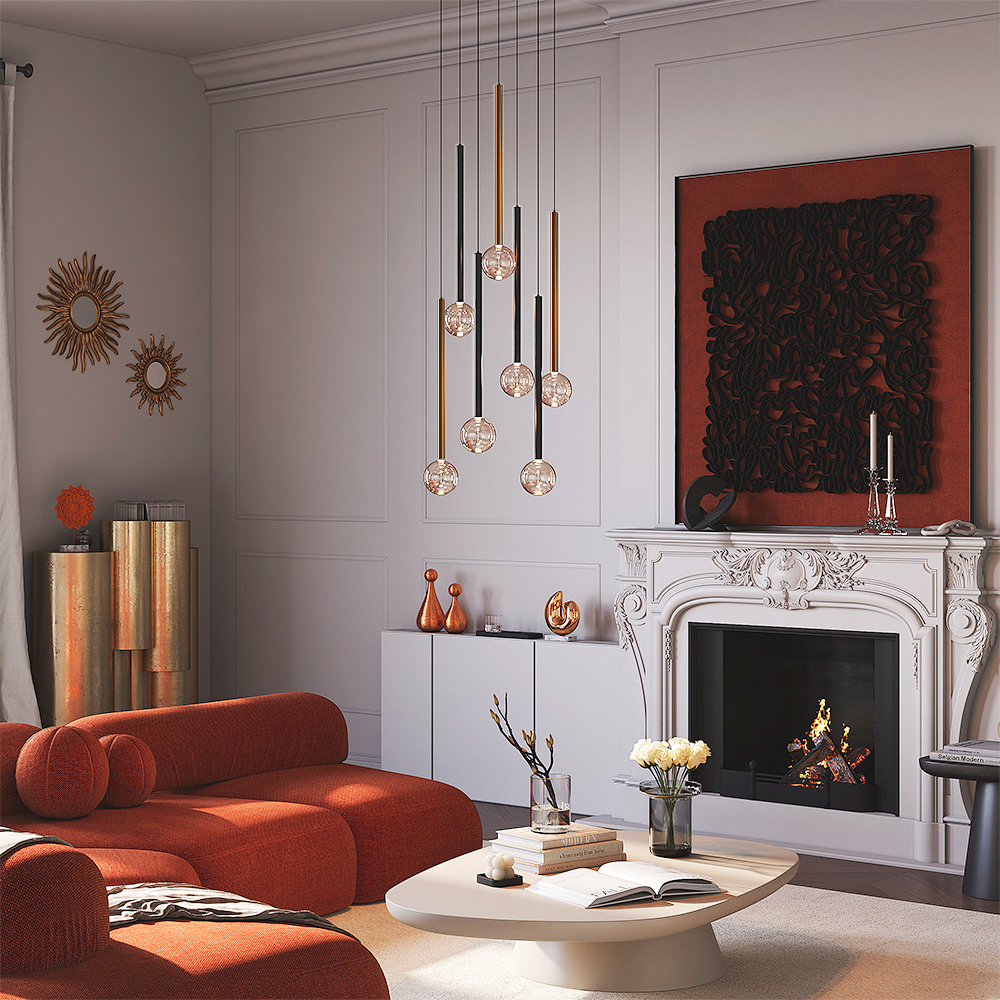 Цвет арматуры — черный, латунь, комбинация черный и латунь. Материал арматуры — металл. Цветовая температура 3000К. Оригинальный «невесомый» дизайн с тонкими металлическими трубками и стеклянными шарами-плафонами. LED-источники света. Регулируемая длина провода подвесных светильников, 3 метра, подходит для помещений с высокими потолками. Каскадная композиция на 7 и 15 плафонов оснащена проводом длиной 3,5 метра для эффектных дизайнерских решений. Подходит для высоких потолков. Парящие модели для создания легкой, воздушной атмосферы в интерьере.