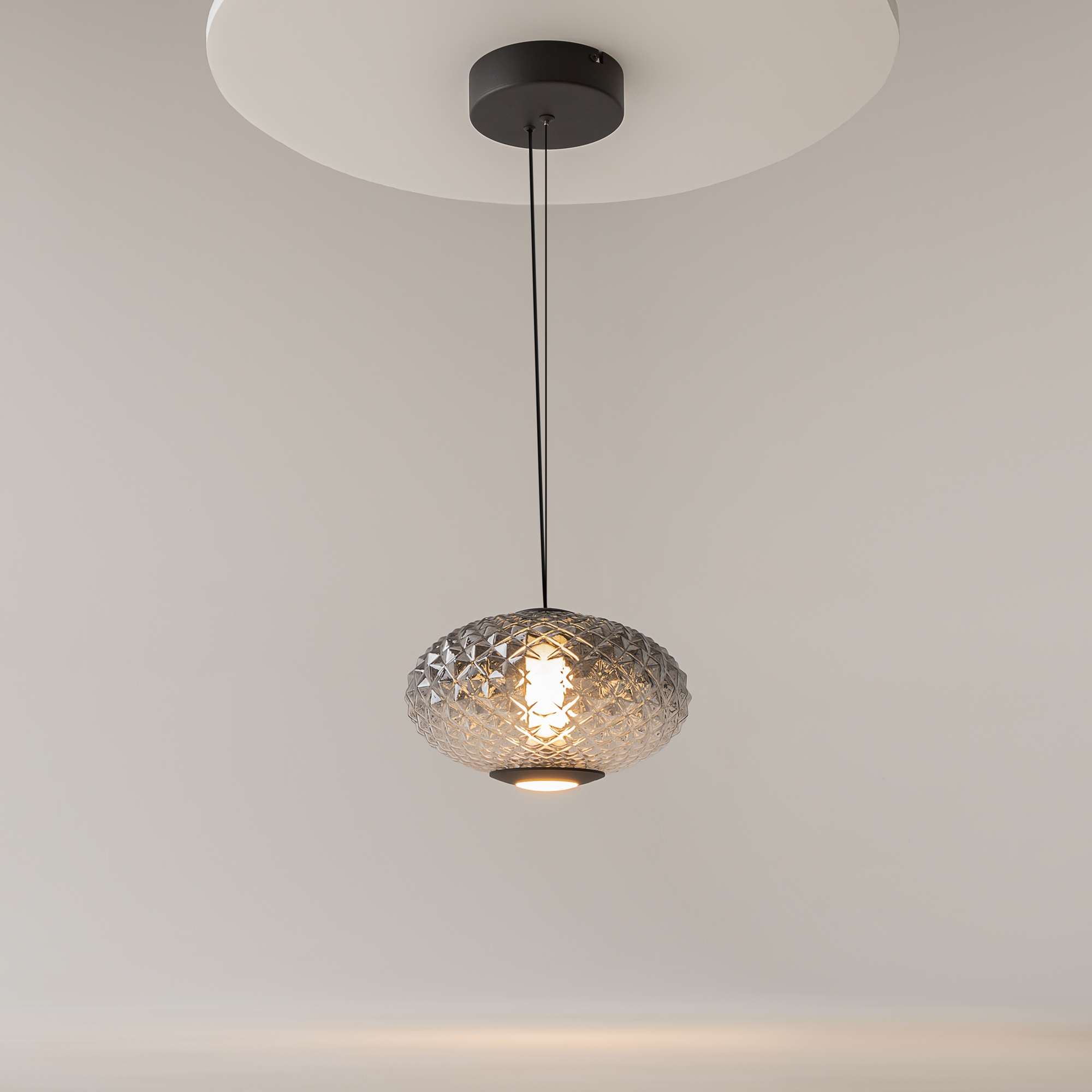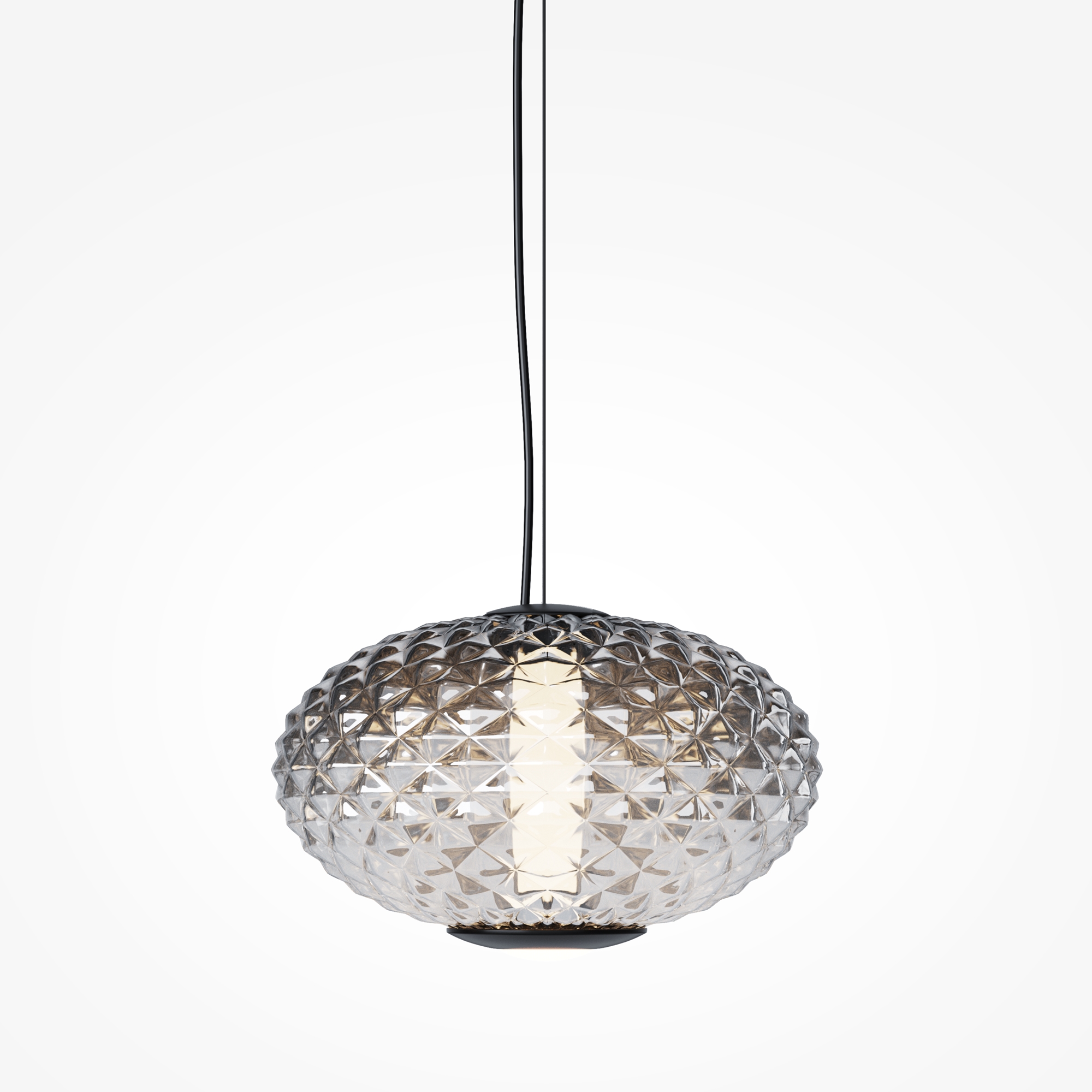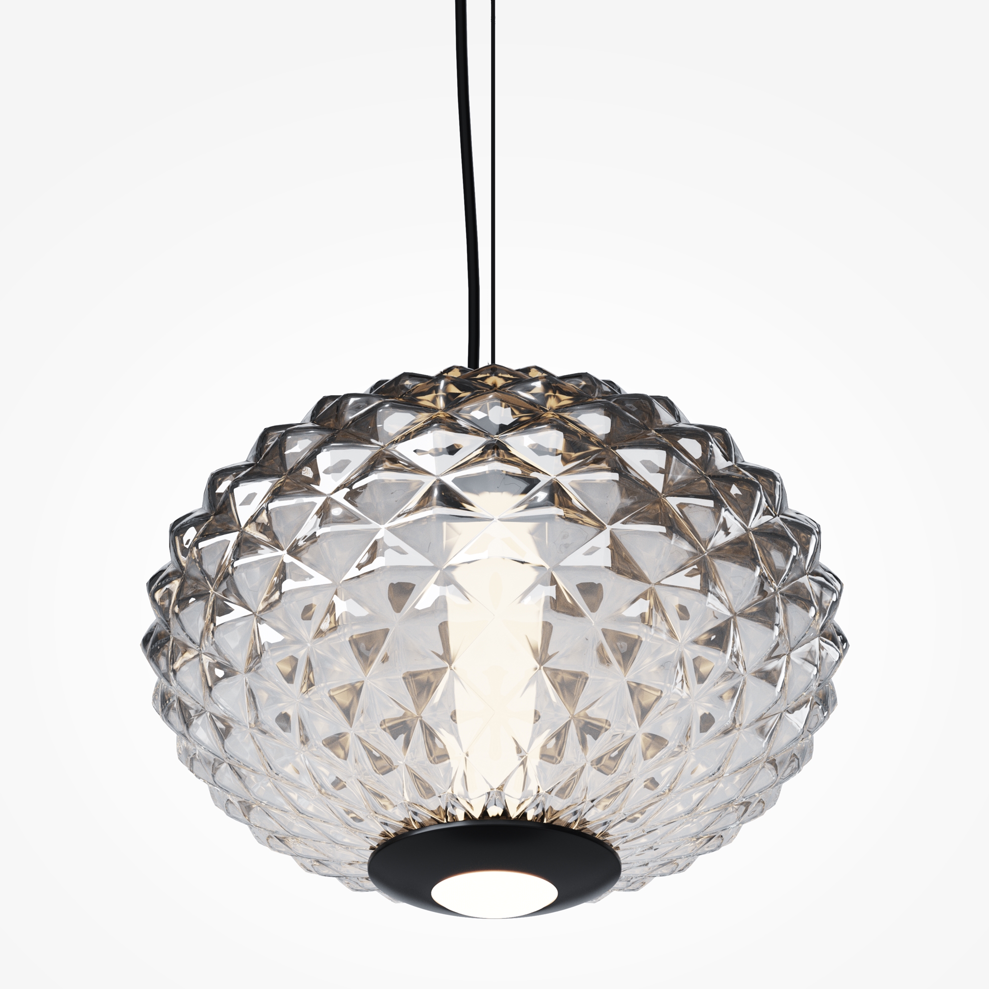 Подвесные светильники серии Bruma представлены в двух дизайнах: арматура глянцевый хром с белым стеклянным плафоном с нанесённым изнутри рельефом; черная арматура с антибликовым покрытием и черный плафон с наружным рельефом. Градиент на стекле от белого или черного к прозрачному. LED-источник света (3000K) имеет два направления: рассеянный и направленный.  Подвесные светильники Bruma дополнят большинство современных интерьеров как в качестве одиночного акцента, так и в композиции друг с другом.