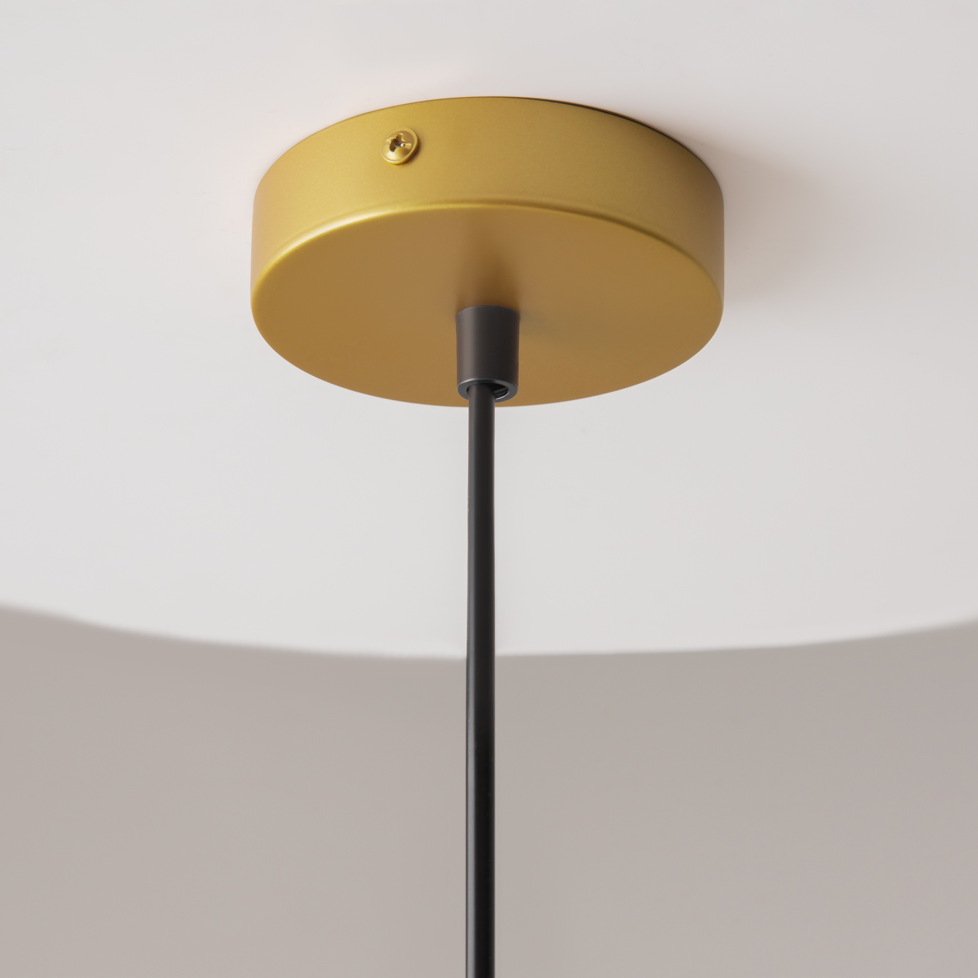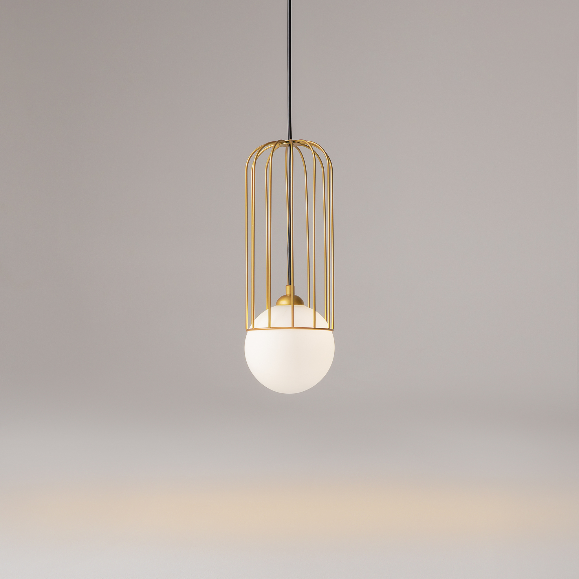 Арматура из металла в золотом цвете. Плафон из матового белого стекла. Декор плафона Telford — решетка из стальной проволоки в тон арматуре. Регулируемая высота.