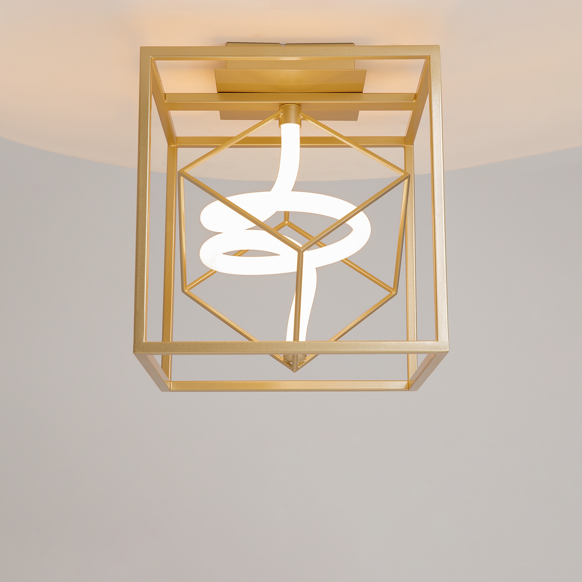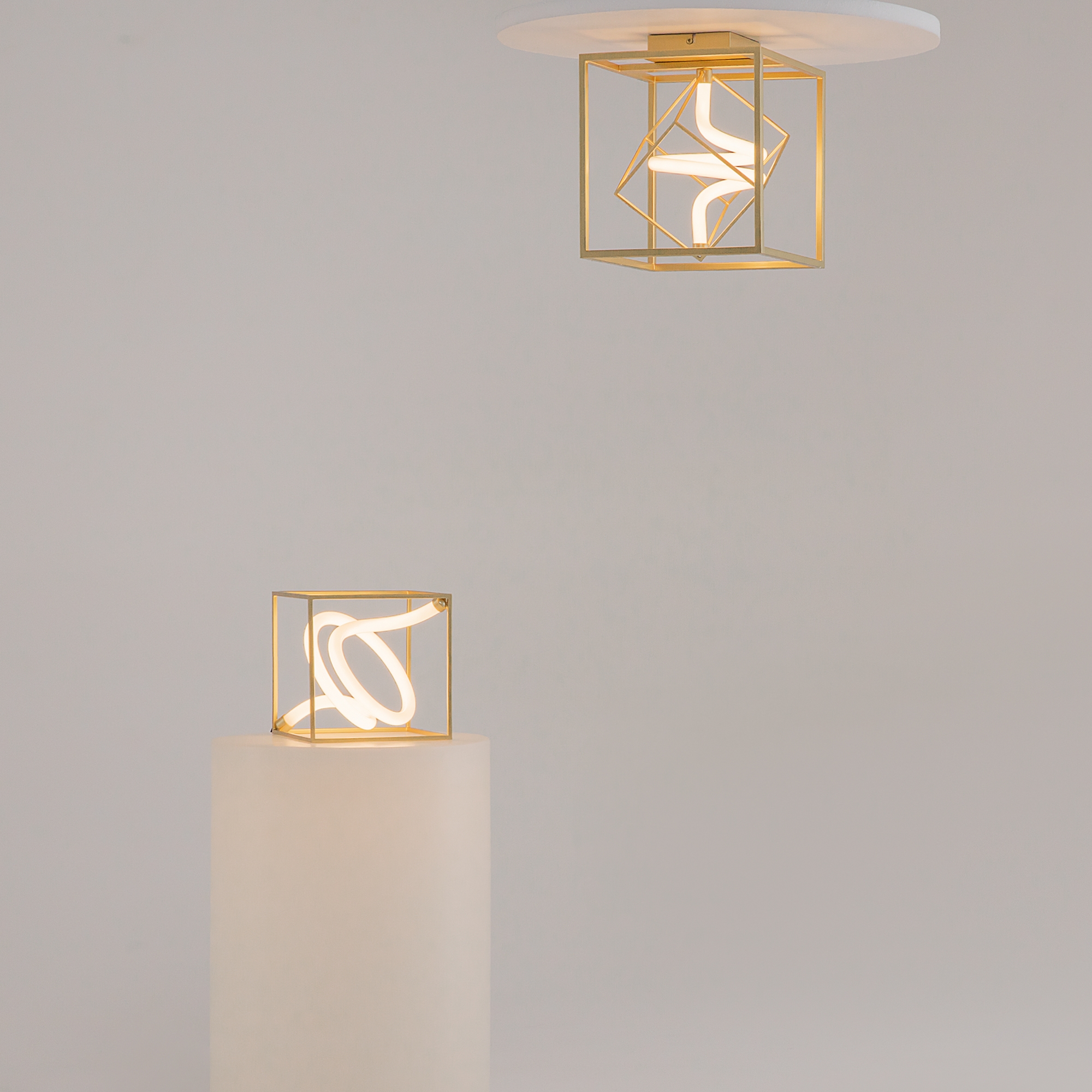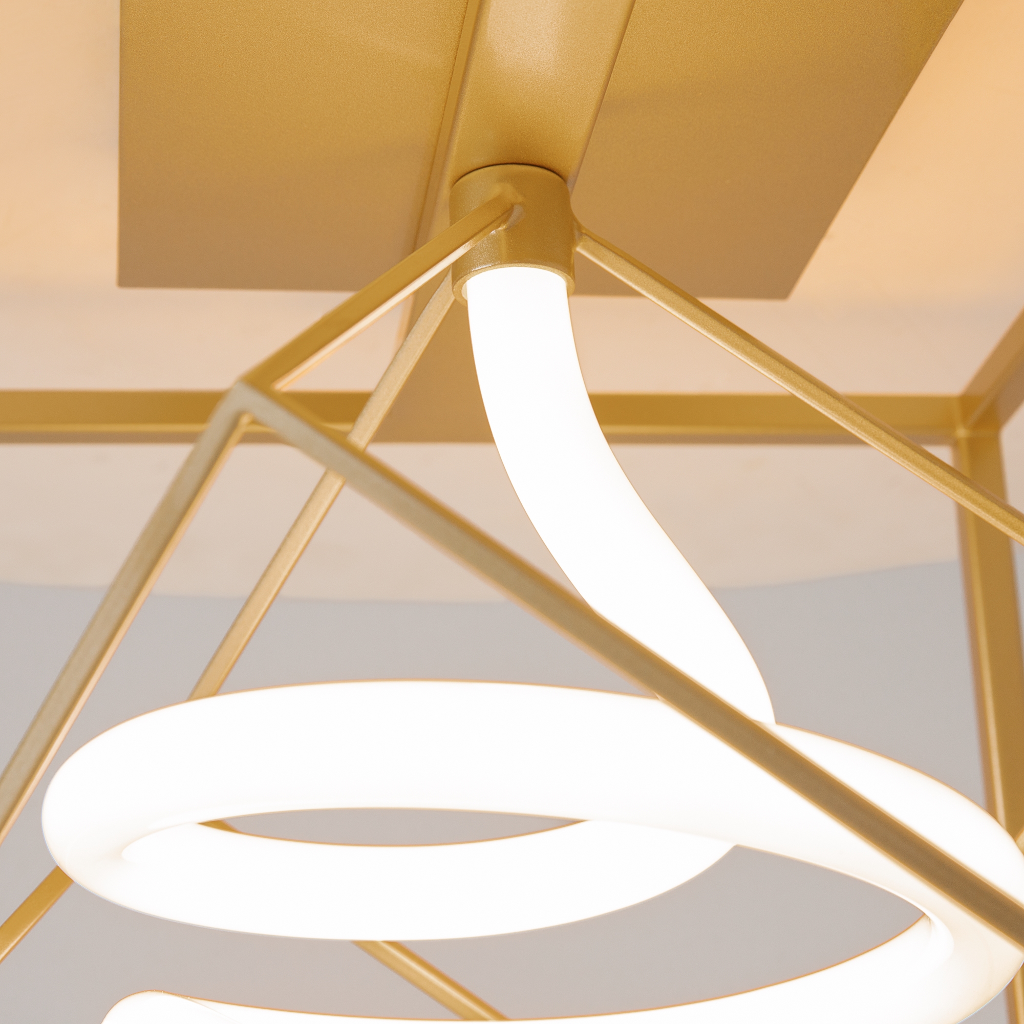 Металлическая арматура, цвет - латунь. Графичный силуэт. Источник света  - гибкая неоновая трубка, расположенная внутри арматуры.   Угол рассеивания — 120 градусов. Дизайн светильников подходит для интерьера в стиле лофт, а также индустриального стиля. Регулируемый провод подвесного светильника — 3 м.