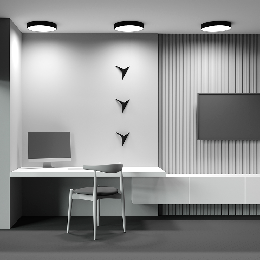 Материал корпуса – металл; цвета – чёрный, белый и золотой. Формы корпуса: круглая и квадратная. Типы монтажа: накладной, подвесной, а также трековые светильники. Подвесной монтаж универсален для обеих форм. Монтаж без видимых болтов. Варианты мощностей: 12W, 24W, 36W, 45W и 90W. LED-источник света. Цветовая температура – 3000 или 4000К. Высокий коэффициент цветопередачи. Совместимость с драйверами DALI и Triac для изменения цветовой температуры и диммирования. Аксессуар для монтажа круглых моделей в ГКЛ под шпаклёвку и универсальное крепление в ассортименте.
